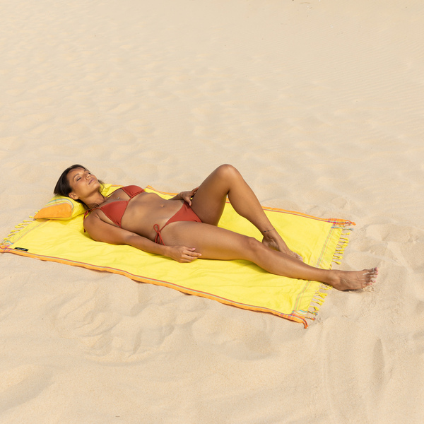 Le Coussin de bain de Simone et Georges révolutionne les siestes sur la plage : une taie d’oreiller en Kikoy (100% coton peigné) fabriqué au Kenya fournie avec son coussin gonflable dans une petite pochette pratique pour emporter partout.