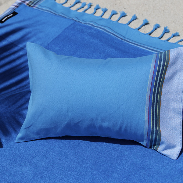 Le Coussin de bain de Simone et Georges révolutionne les siestes sur la plage : une taie d’oreiller en Kikoy (100% coton peigné) fabriqué au Kenya fournie avec son coussin gonflable dans une petite pochette pratique pour emporter partout.