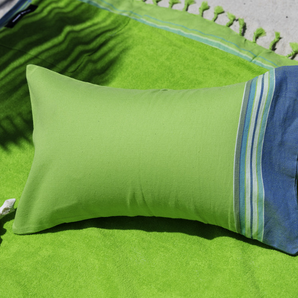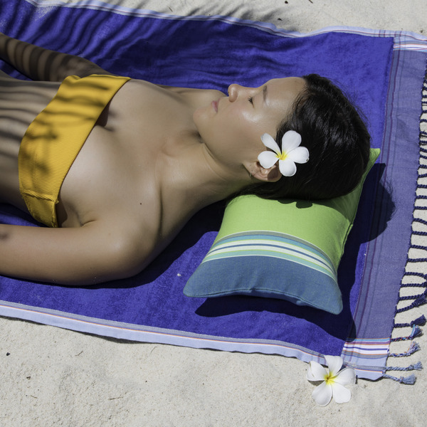 Le Coussin de bain de Simone et Georges révolutionne les siestes sur la plage : une taie d’oreiller en Kikoy (100% coton peigné) fabriqué au Kenya fournie avec son coussin gonflable dans une petite pochette pratique pour emporter partout.